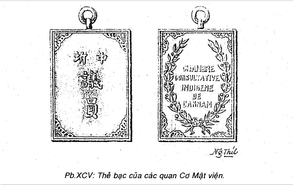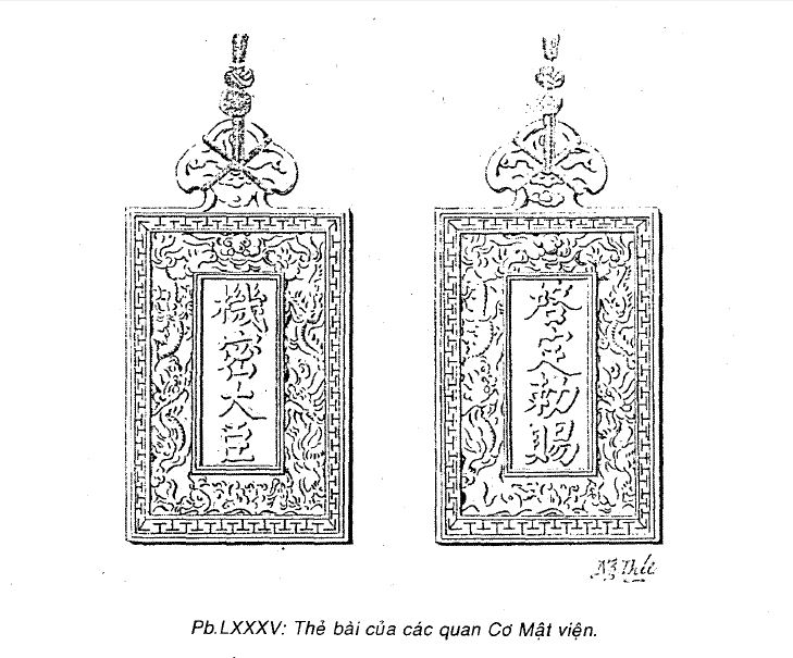 Năm Minh Mệnh thứ 16 (1835), những viên Đại thần và Hành tẩu ở Viện, được cấp cho mỗi người một cái thẻ bài. Thẻ bài của quan Đại thần bằng bạc mạ vàng, y như kiểu bài của quan Thượng thư Lục bộ, nhưng dài hơn 1 phân, mặt bài khắc bốn chữ “Cơ mật Đại thần”; thẻ bài của viên Hành tẩu làm bằng ngà, y như kiểu bài của Viên ngoại lang, mặt bài khắc bốn chữ “Cơ mật hành tẩu”.