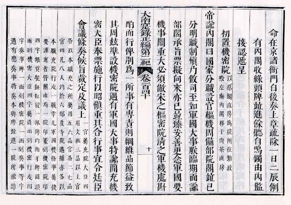 Năm Minh Mệnh thứ 15 (1834), nhà Vua cho lập Cơ mật viện là cơ quan tham mưu cho nhà vua những vấn đề trọng yếu, cơ mật, đặc biệt về quân sự. Đứng đầu Cơ mật viện là các đại thần phẩm trật từ Tam phẩm trở lên, cao hơn quan đứng đầu Nội các. Sự xuất hiện của Cơ mật viện triều Nguyễn là một bước tiến trong việc tổ chức bộ máy quản lí Nhà nước tại Trung ương của chính quyền quân chủ cuối cùng ở Việt Nam.